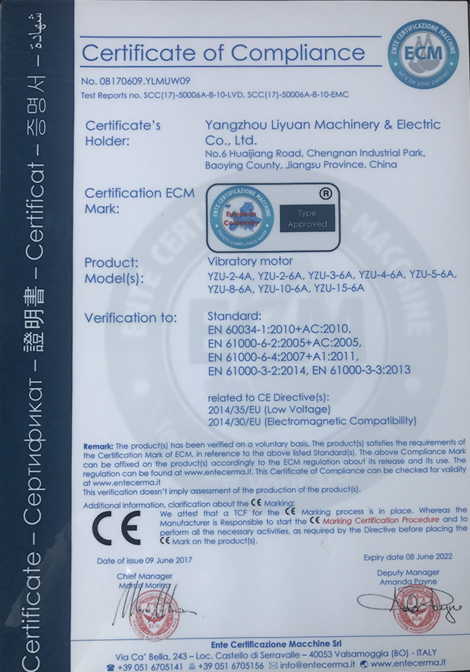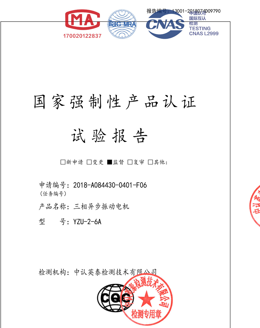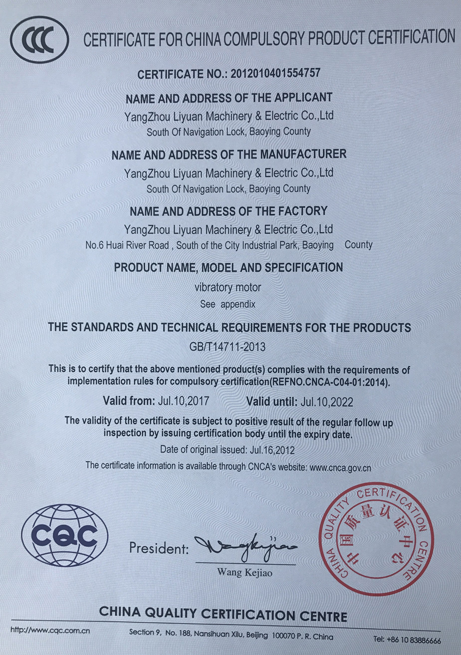 公司制造的振動機電產品,節能環保,符合GB/T19001-2008/ISO9001-- 2008質量管理體系標準,2012年通過國家3C強制性產認證,2016年取得了歐 洲CE認證證書。產品銷往全國各地,是國家中儲糧定點廠家的配套單位,是橡 塑、礦山、化工、糧機精選機械行業配套公認品牌。